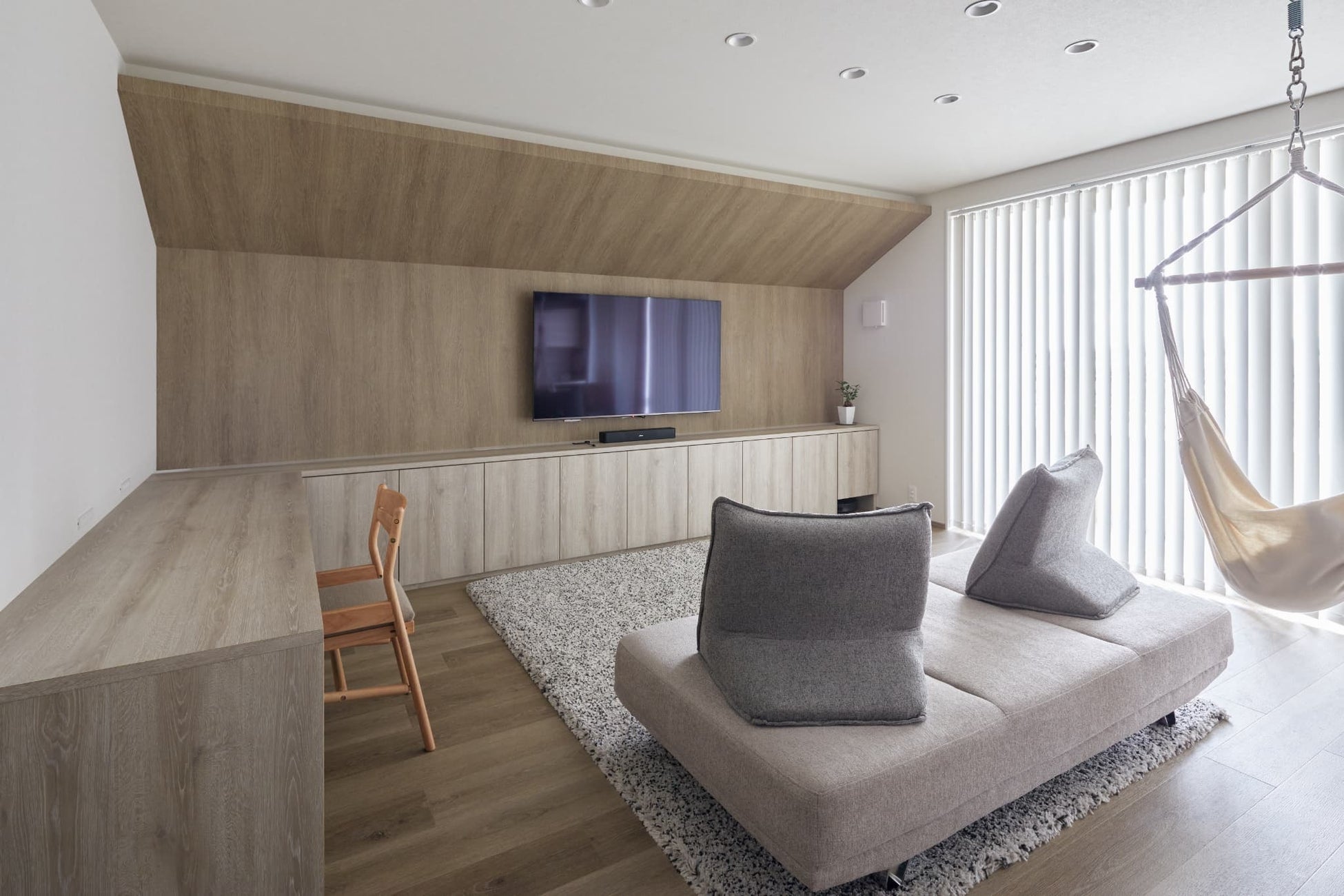 通常高さ40cmのところ70cmと、間口いっぱいにテレビボードを造作しました。扉をつけることでスッキリとした見た目で、圧迫感のないつくりに仕上がっています。テレビボードと一体化したワークカウンターは幅220cmあり、お子さまが3人並んで勉強ができます。