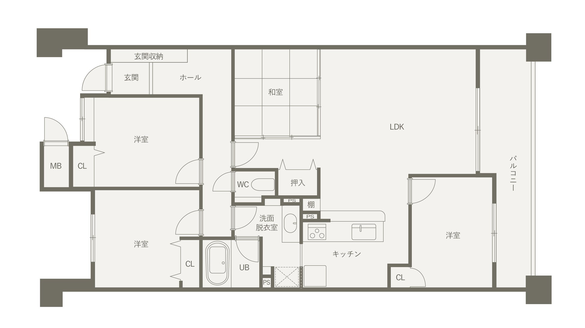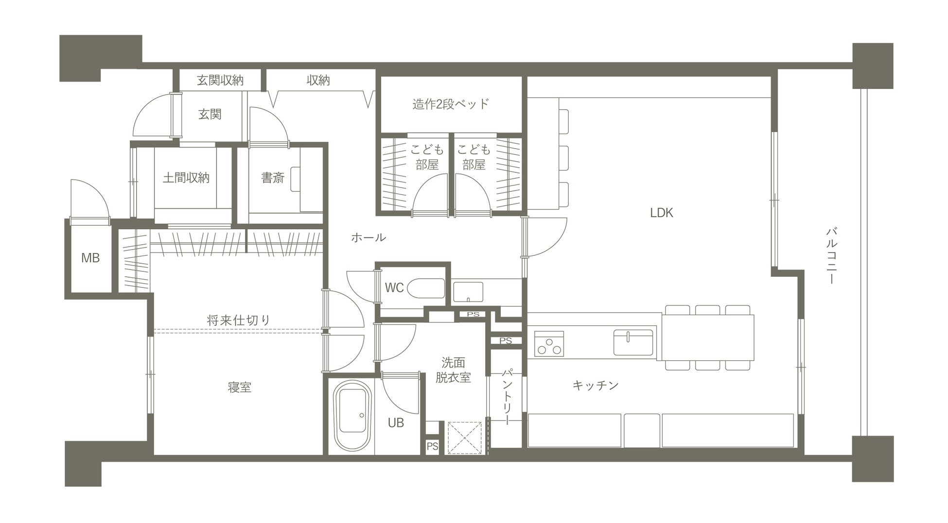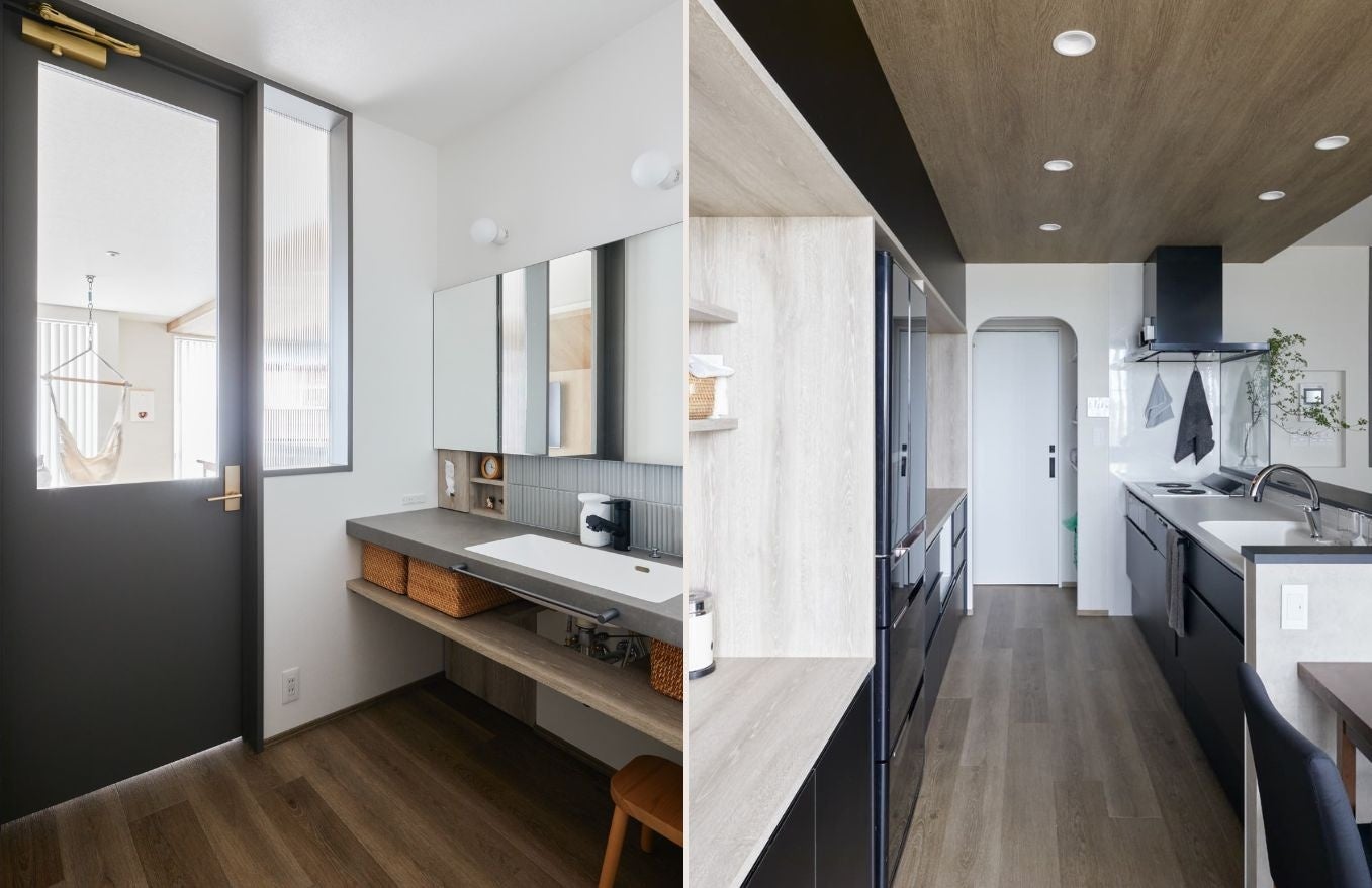 キッチン⇔パントリー⇔脱衣所⇔廊下と続く動線計画として、家事のしやすい間取りに。洗面台があった脱衣所は、洗面台を無くして物干しスペースにし、洗面台はLDKに続く廊下の動線内に配置しています。