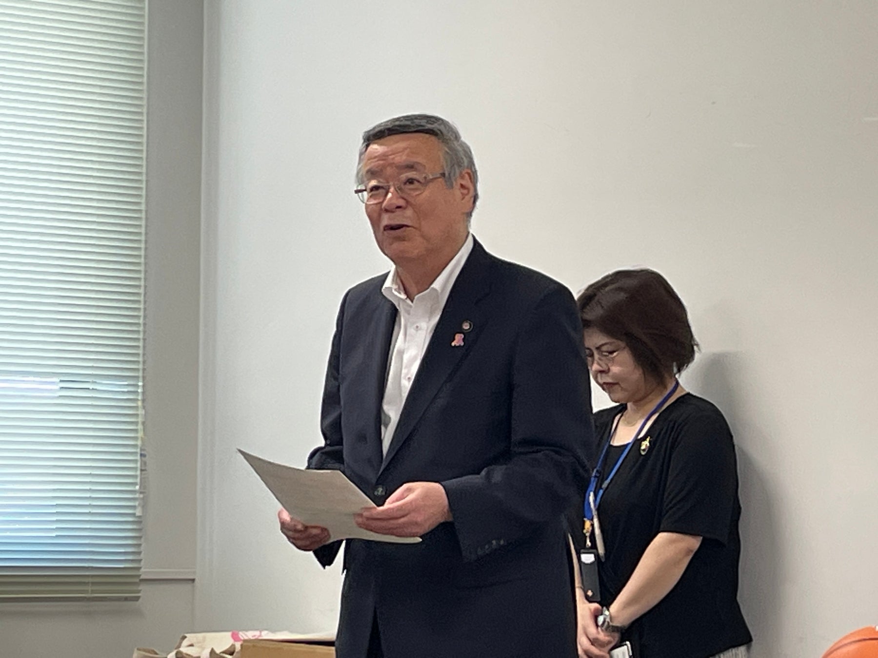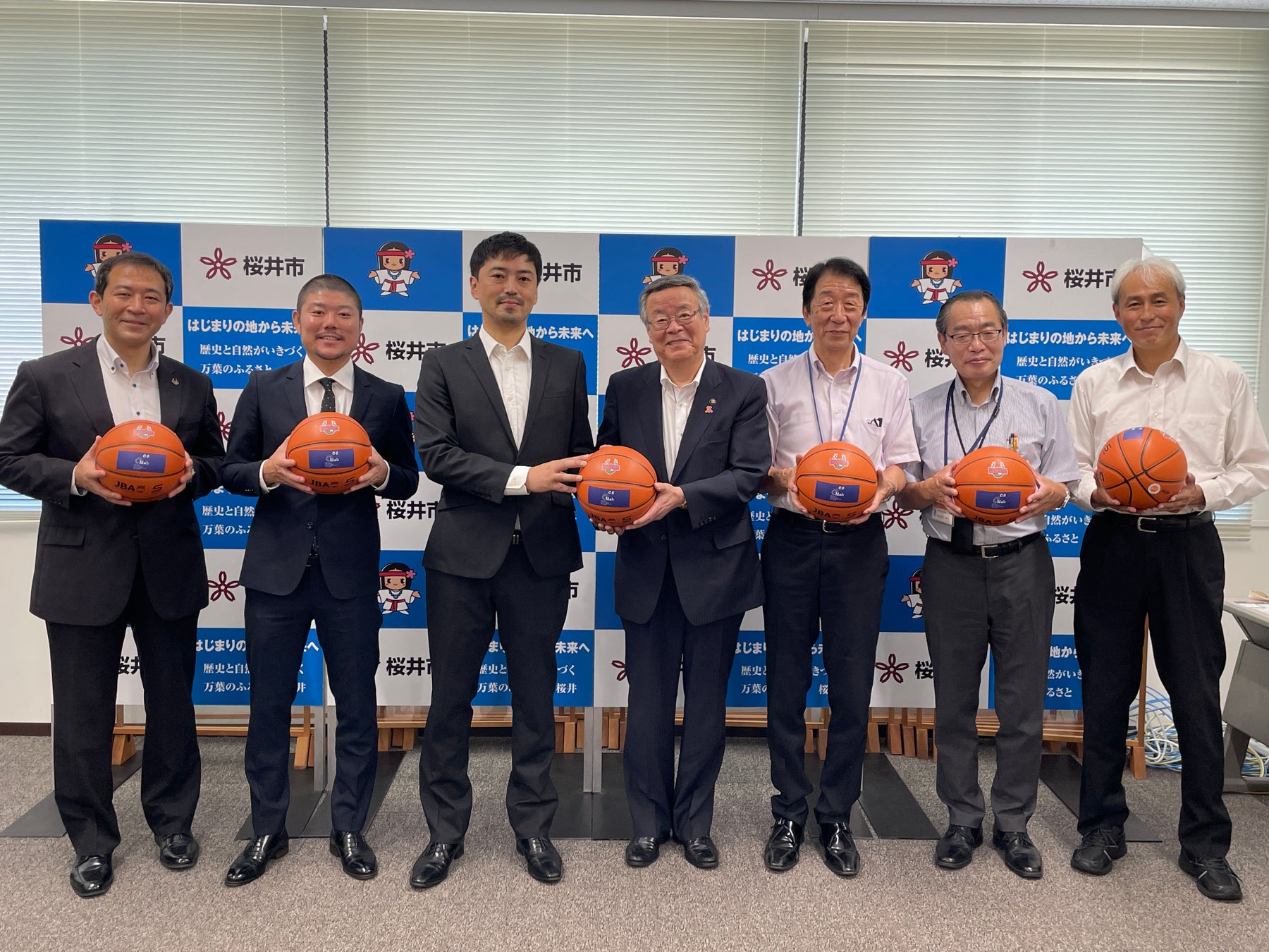 9月2日には、桜井市役所にてバスケットボール贈呈式が行われ、コードエフ代表取締役の森井啓隆様から松井正剛 桜井市長へバスケットボールが贈呈されました。