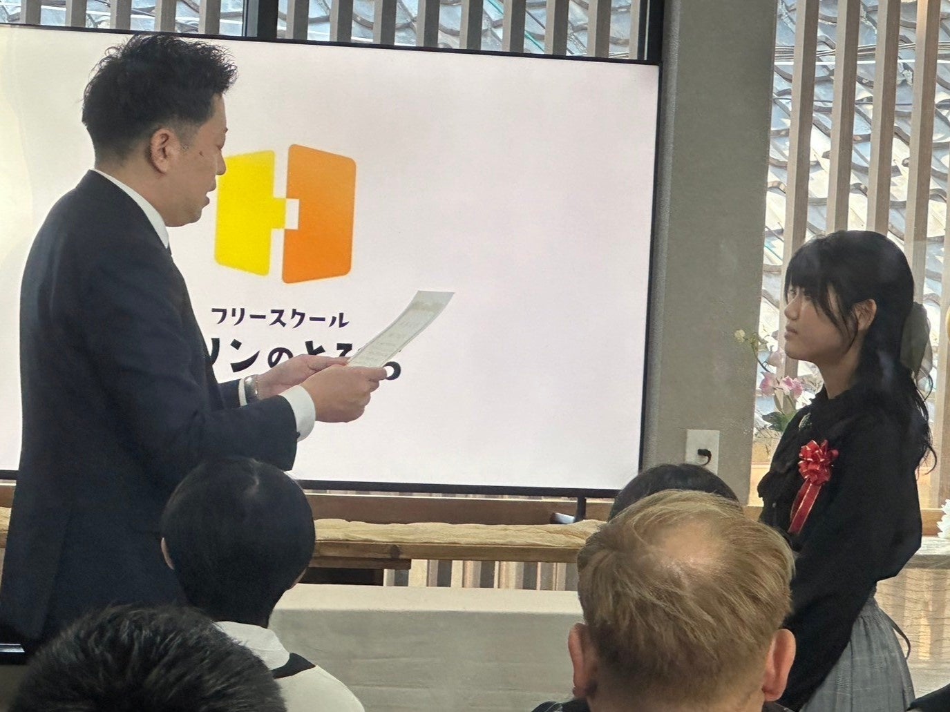 代表の水取から卒業生に一人ひとり手渡された卒業証書は、書かれている文章がそれぞれ異なり、卒業生一人ひとりの人柄を称えフリースクール「キリンのとびら」を卒業することを証するものとなっています。