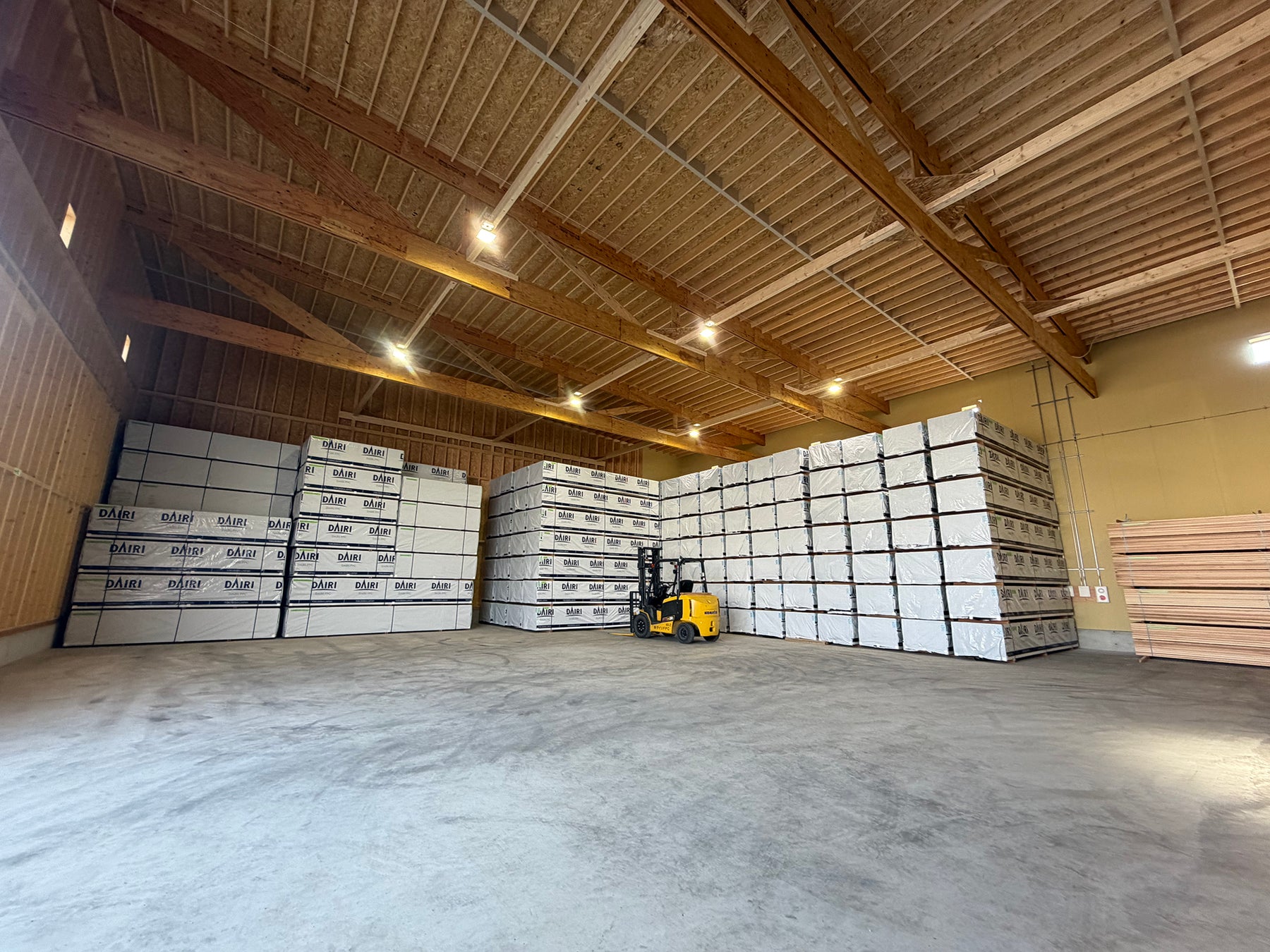 本倉庫では、ツーバイフォー工法をベースとした壁工法に、高強度トラス構造を組み合わせることで、木造でありながら十分な強度と耐久性を確保しています。分散荷重による基礎負担の軽減や、施工性の高さによる工期短縮・コスト抑制にもつながっています。また、木造倉庫は気密性が高く、汚れが付きにくい点も特長で、木材の品質を維持するための安定した保管環境を確保しやすい構造となっています。