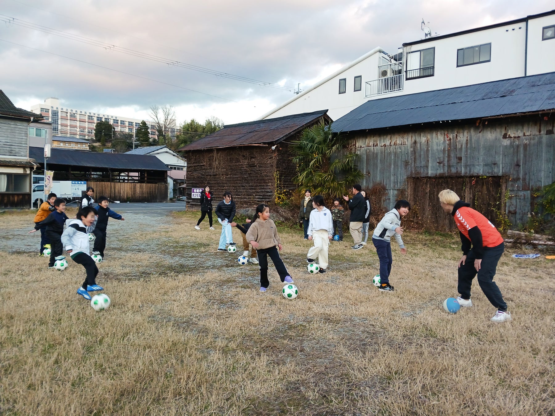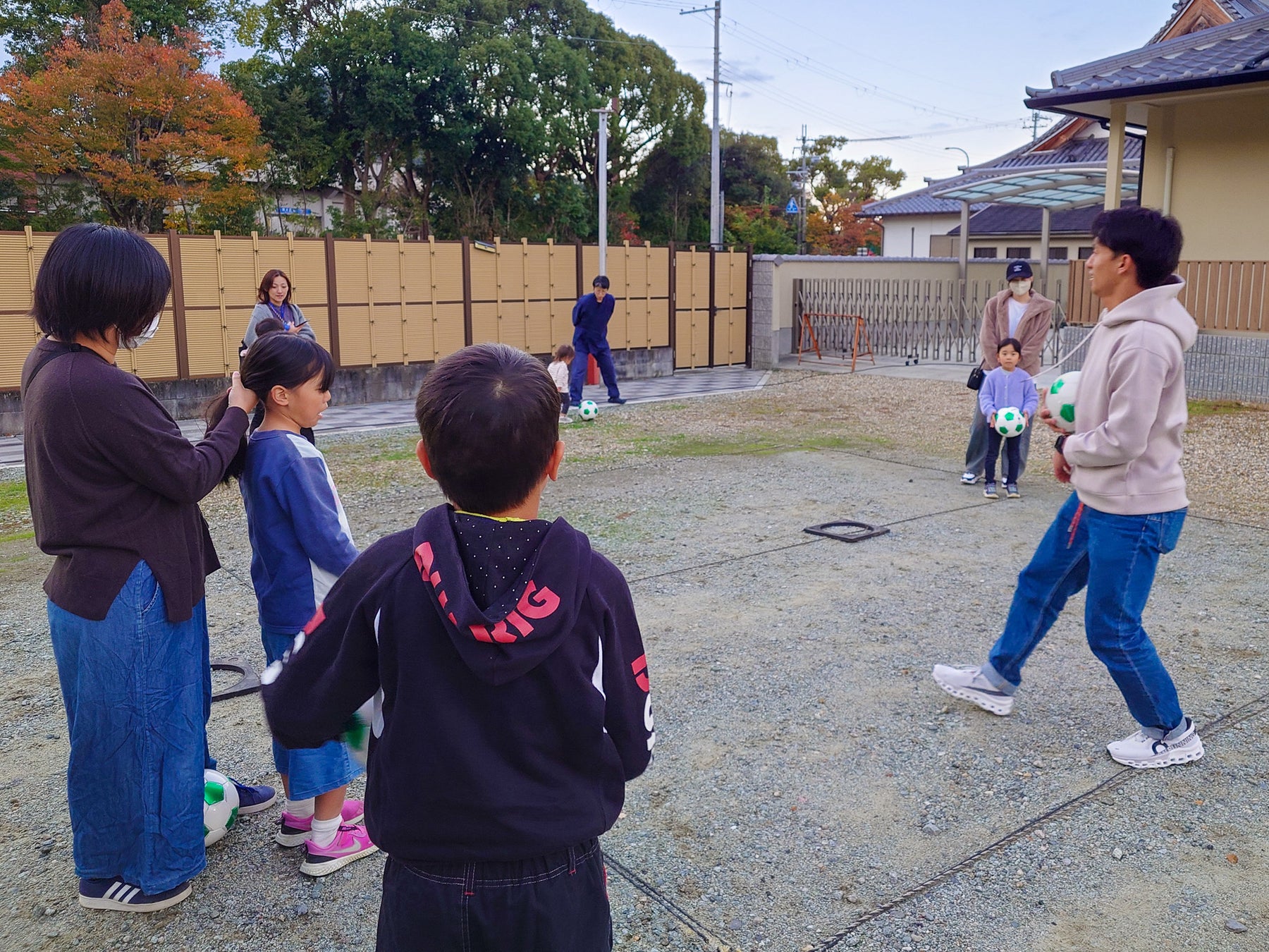 まずは駐車場でボールを使ったレクリエーションを行いました。「サッカーはあまり得意じゃない……」と言って最初は見ているだけだった子も、最後にはみんなと一緒になってボールを蹴っていたのが印象に残りました。