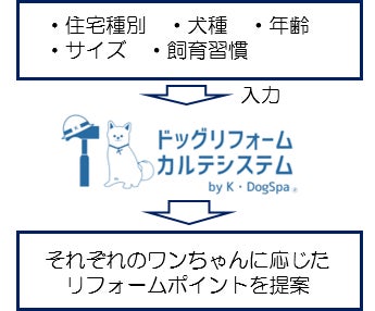 本サービスは、飼い主様が犬種や年齢、飼育習慣を入力するだけで、その愛犬に最適なリフォームポイントを検索できる「ドッグリフォームカルテシステム by K・DogSpa(以下、「本システム」という)」を獣医師等の監修の元で当社が開発し、リフォーム担当者が一緒に最適なリフォームプランを考え出すサービスです。2025年7月7日(月)から近鉄のリフォーム「ニューイング」の各店舗においてサービスを開始します。