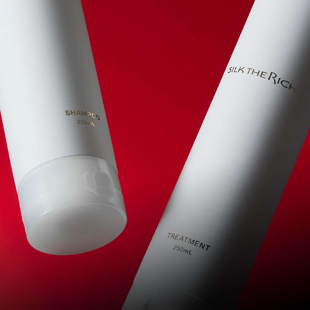 「SILK THE RICH」は、シルクの再生補修成分を配合したヘアケアブランドです。3種類のシルク成分が髪の汚れを落とし、地肌に栄養を与え、コーティングし独自の光沢を与えます。また、通常のヘアケア製品の約2倍の香料を配合しているため、翌日までRICHな香りを楽しめます。「価格」でなく「品質」をブランドコンセプトに、毎日がサロン帰りの様なシルクヘアを目指し、シルクが生み出す独自のツヤ感と指通りを実現できる補修・保湿効果の高い商品です。