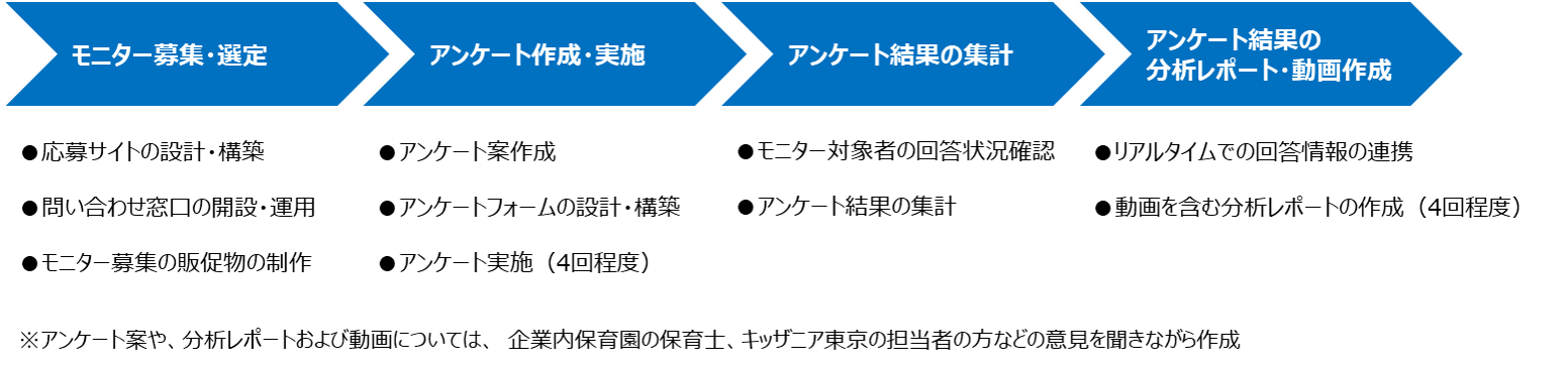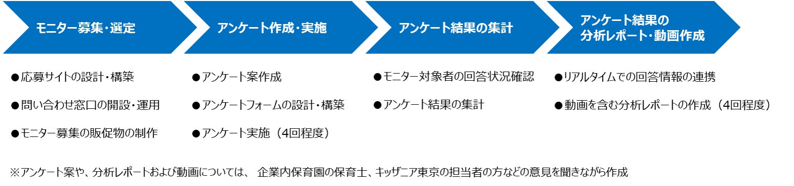 当社は、本人確認やセキュリティを担保した調査フローの業務設計を行い、応募に関する問合せ対応、Web上でのアンケート作成や回答の集計、調査レポートの作成といった最終報告まで、本事業全体の運営を支援します。
