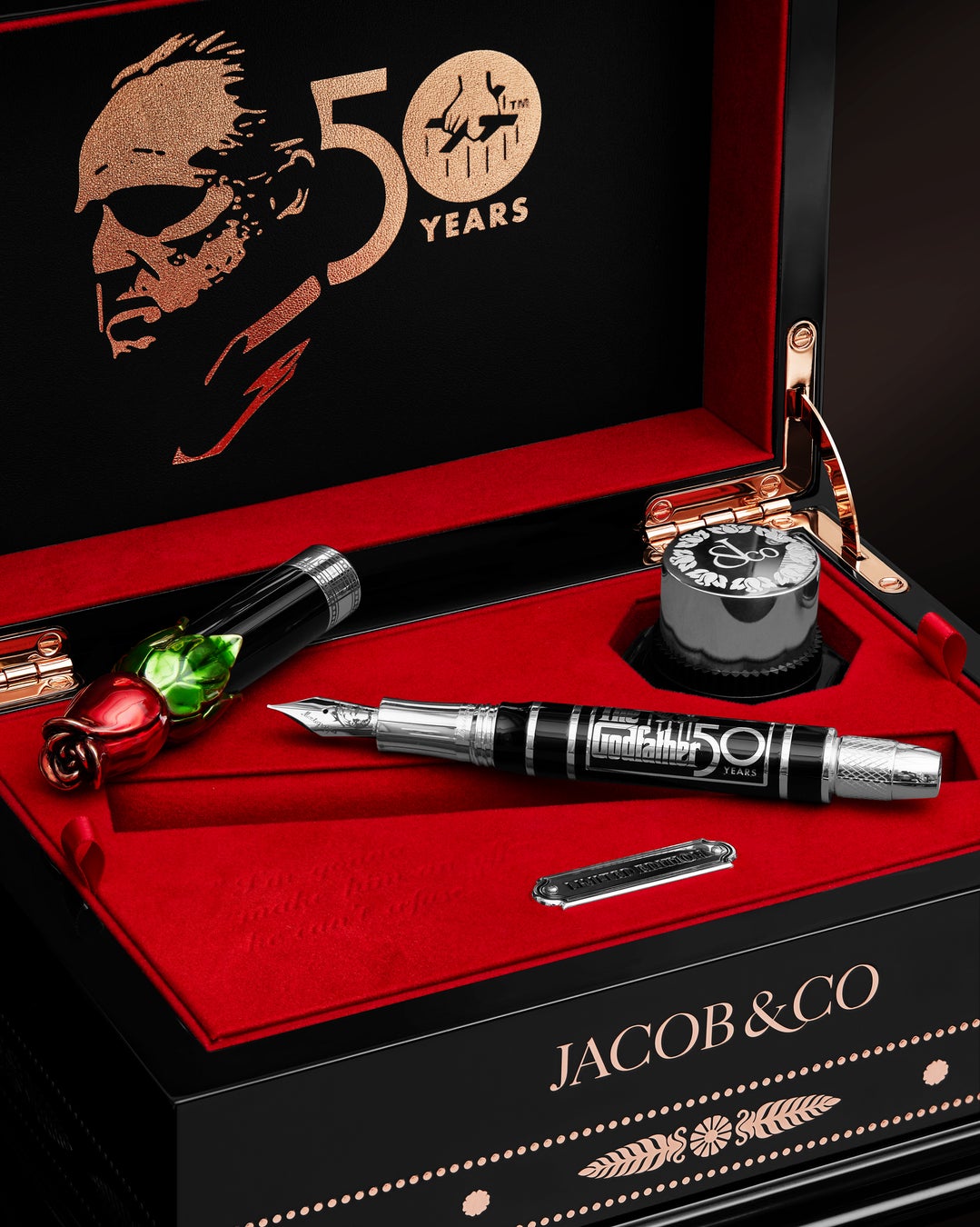 50周年記念モデルで登場した筆記具は、「ゴッドファーザー ペン」としてコレクション化されています。赤いバラやリボルバーをモチーフにした機構など、象徴性が緻密にデザインへ置換されています。