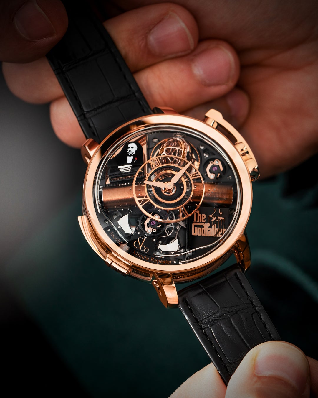 対して、ゴッドファーザーという映画の世界観と、ジェイコブ&コーならではの複雑機構の結びつきを極限まで高めたアートピースとしては、2020年に発表された「オペラ ゴッドファーザー ミニッツリピーター」が挙げられます。ミミニッツリピーターによる時刻の音色と、ミュージックボックスが奏でるテーマ曲が同居する唯一無二のモデルで、“時を告げる音”と“物語を奏でる音”が融合した音響芸術の到達点と言えます。音色の重層性と、構造の複雑さが極めて高い次元で融合し、『ゴッドファーザー』の世界がより深く、より立体的に腕元で息づく作品となっています。