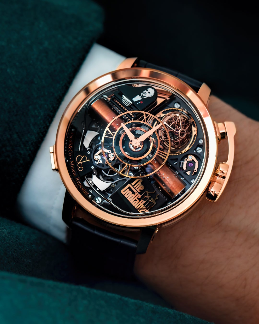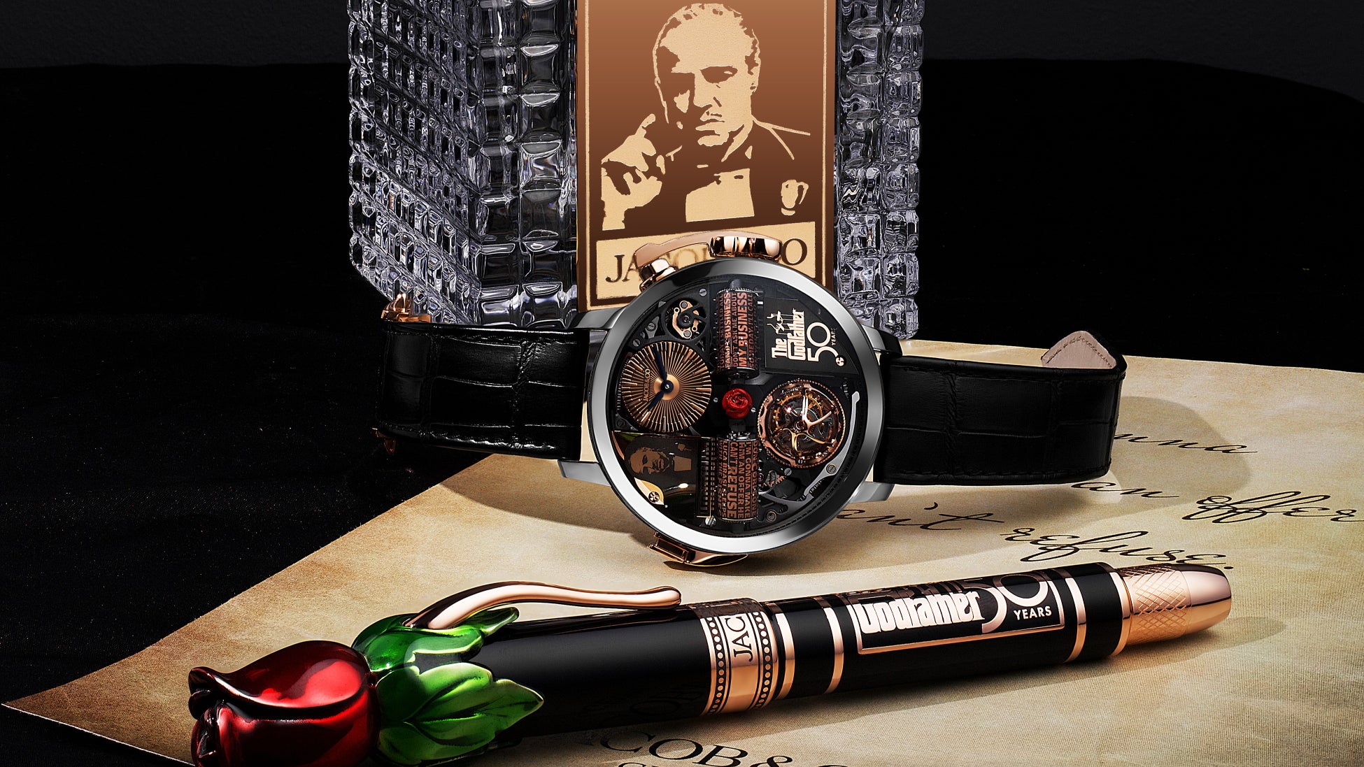 ジェイコブ&コーは、パラマウント・ピクチャーズと時計ブランドとして史上初のライセンス契約を締結し、映画『ゴッドファーザー』の世界観・タイトル・テーマ音楽を腕時計というフォーマットに落とし込む、極めて稀有なメゾンです。