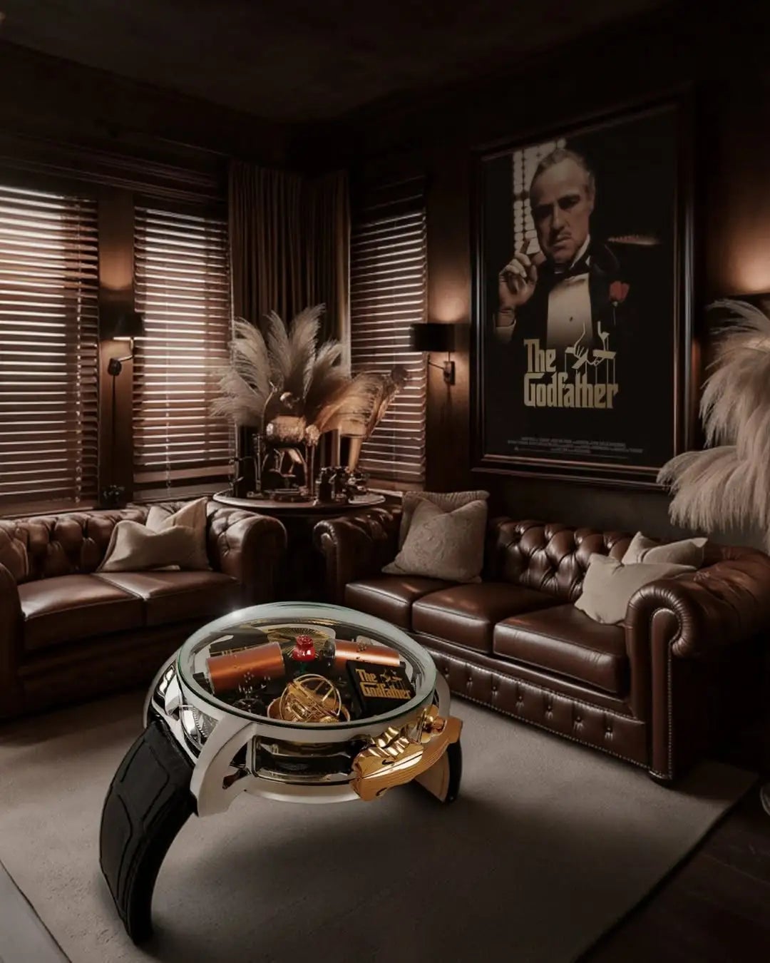 映画『ゴッドファーザー』を象徴するモチーフが文字盤の上に立体的に構成されている点が特徴です。ケース内には、ヴィトー・コルレオーネのミニチュア彫刻、バイオリン型クランクやピアノを思わせる装飾が組み込まれ、小さな舞台装置のように立体的な世界が広がります。