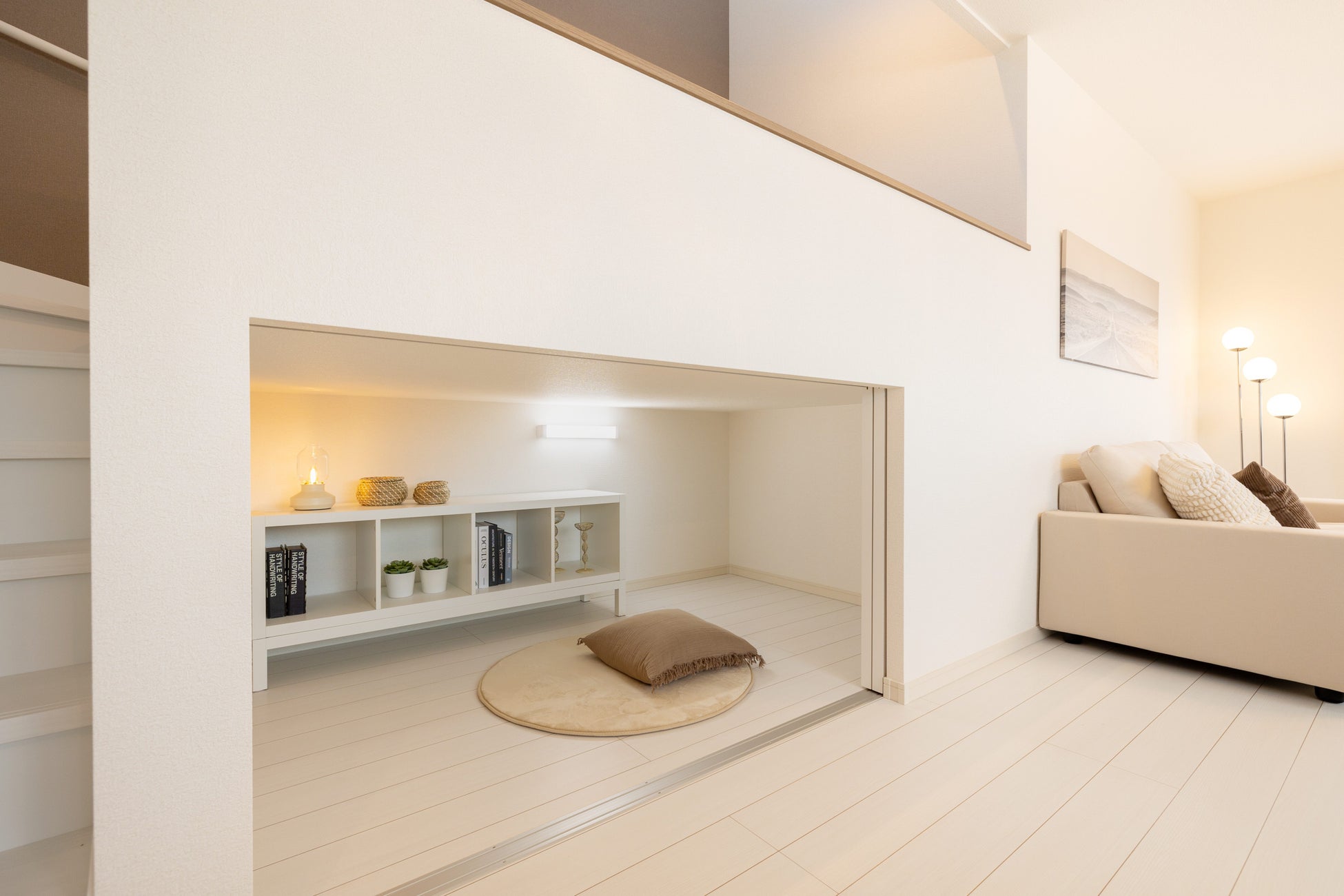 家の中で家族が最も集まる場所はLDKです。そのLDK横に約3帖のスキップフロアを作ることで、「家族の時間」がより心地よく楽しくなるようにしました。子供たちはスキップフロアの下段で思いっきり遊び、その声を聞きながら上段のタタミスペースで心地よい昼間の眠りに包まれる…。