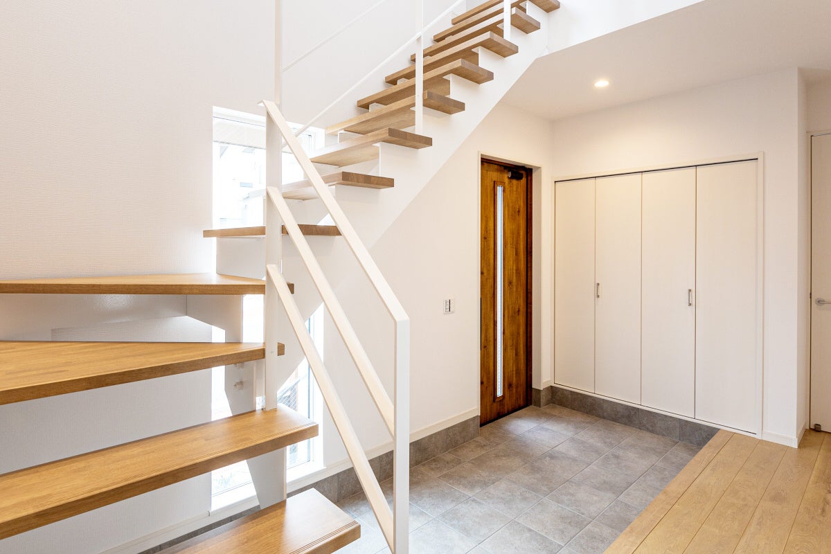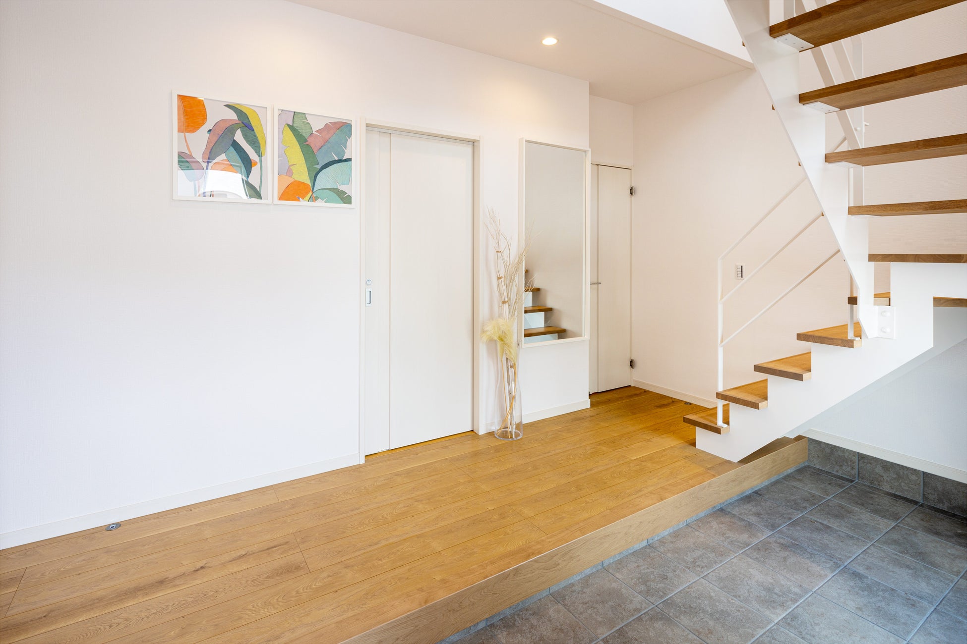 玄関は帰宅時やラ放射が訪れた際に「最初に目にする」場所。「住まいの第一印象が決まる」場所です。だからこそ、空間を広く使って、玄関のデザイン性を高める設計にしました。玄関扉を開けた瞬間に感じる広々とした空間の心地よさは、家に訪れる全ての人に「この先にはどんな素敵な部屋が広がっているのだろう」というワクワクした気持ちを抱かせてくれます。