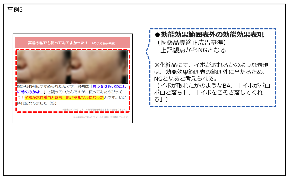 例5:医薬部外品ではないシワに関する商材において、シワは完全になくなった、しわがピーン!、などのシワがなくなるかのような表現。