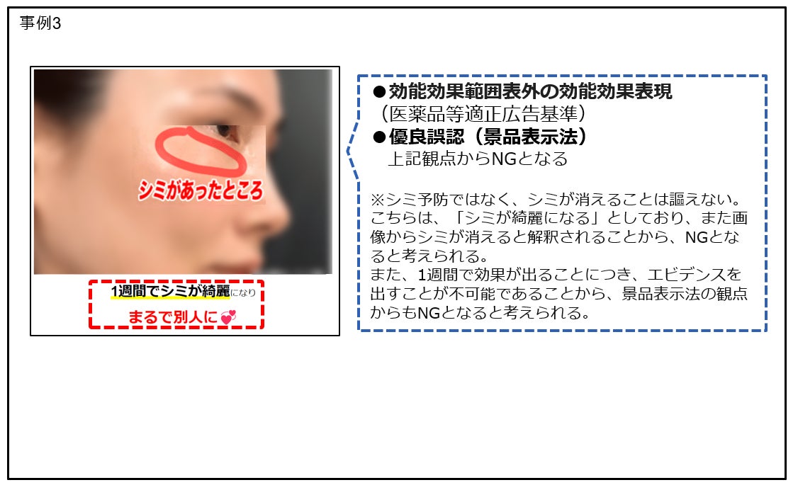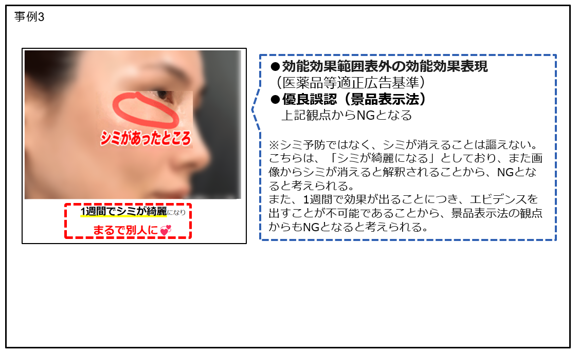 例3:(肌を指して)ぷるん、デトックス効果、身体の酸化を防ぐ、若返り、若見え、BA画像を用いてしみなど肌に対する効果があるように誤認させるような表現