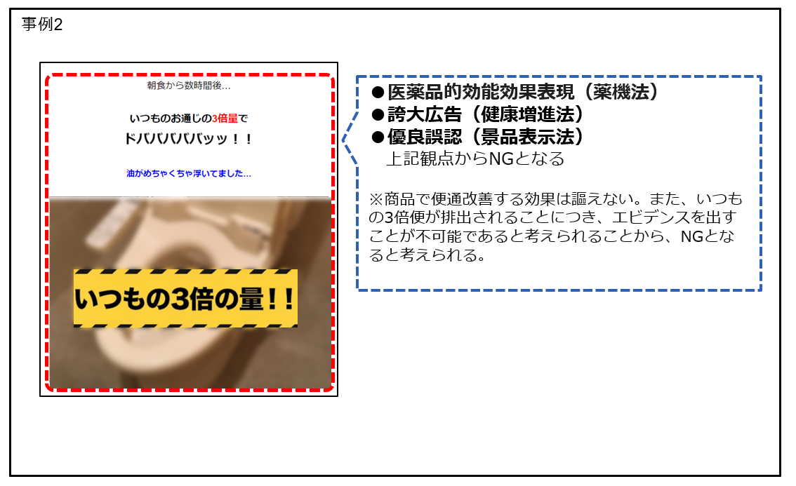 例:目のコントラスト感度を改善する機能に対して眼鏡が必要なくなるかのような訴求表現、BA画像や対比画像などを用いて視力が改善されると誤認させるような表現、脂肪便や代謝を高める機能、あたかも体質改善がなされてリバウンドしないと誤認させるような表現