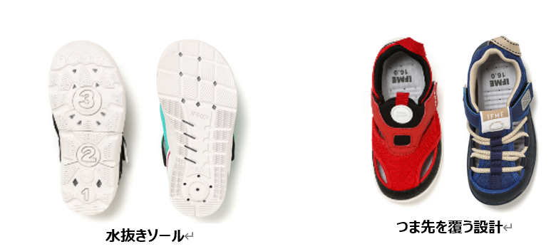 ソールにはIFMEのウォーターシューズでおなじみの、「水抜きソール」を採用。ソールの穴から水が排出される構造になっているため、水はけがよく速乾性に優れています。 また、アッパーはつま先を覆う形になっているため、指先のケガを防ぎ、子どもたちの水場遊びをサポートします。