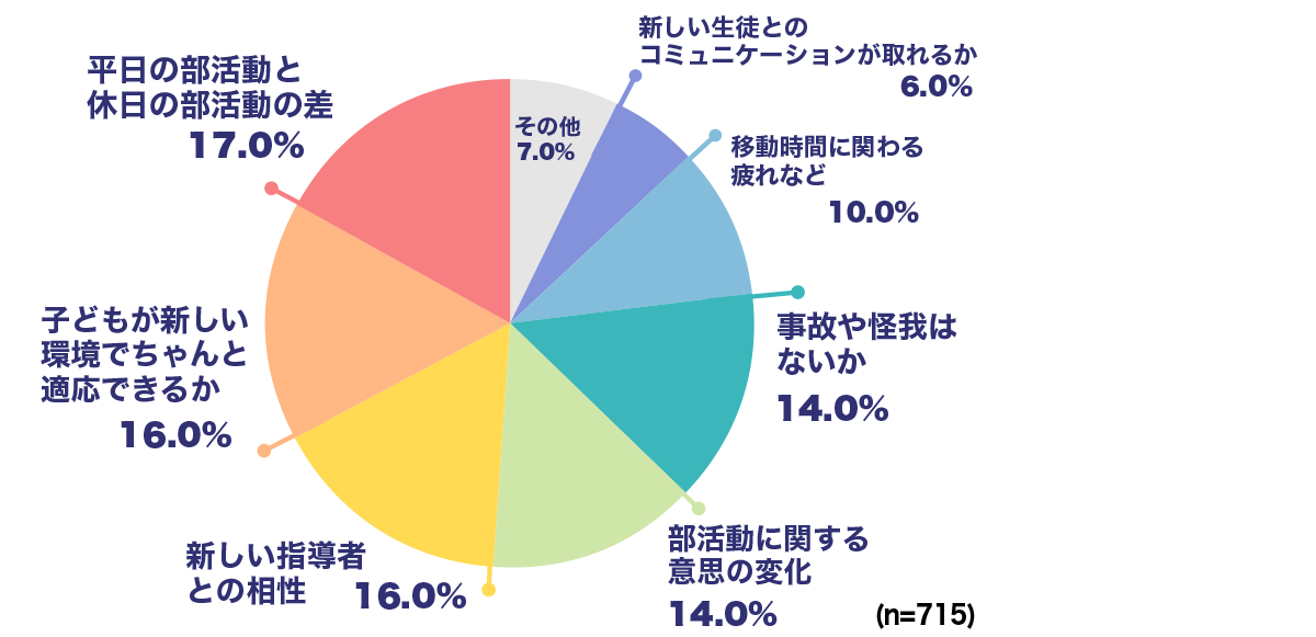 「平日の部活動と休日の部活動の差」が17%、「子どもが新しい環境でちゃんと適応できるか」「新しい指導者との相性」が各16%と結果となりました。普段の生活から、慣れの問題や、環境が変わることによる不安や心配があることが伺えます。