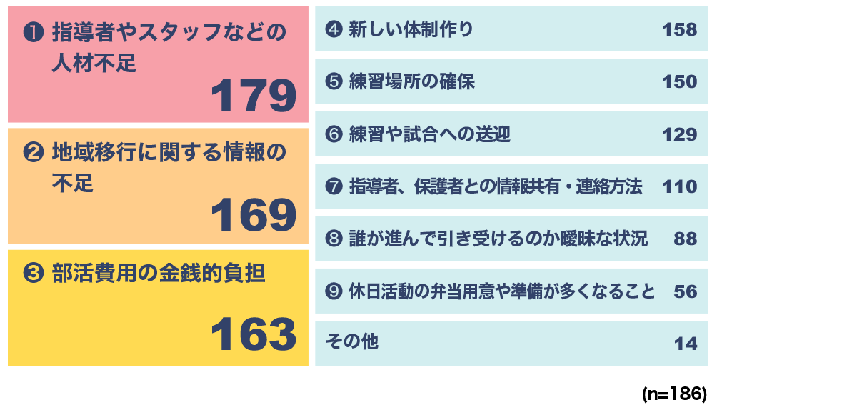 「指導者やスタッフなどの人材不足」「地域移行に関する情報の不足」「部活費用の金銭的負担」の回答が最も多く、指導者の人材不足や、地域移行の詳細、費用の負担などが実際準備する側として気になっている様子が伺えます。他にも「新しい体制作り」「練習場所の確保」など環境が変わることによっての気になるところもありました。