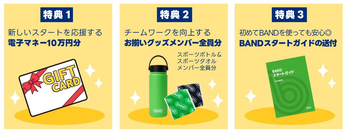 また、これから部活動の地域移行の進める上で、その活動を少しでも後押しできるように、抽選で30チームには「電子マネー10万円」を提供し、チームワーク向上にも役立つ「お揃いグッズ」もメンバー全員分プレゼントします。さらに、新しく参加されたメンバーがはじめてBANDを使う際にも役立つ、BANDのインストールから主な機能の使い方までを説明した、特製スタートガイドを無料で配送いたします。
