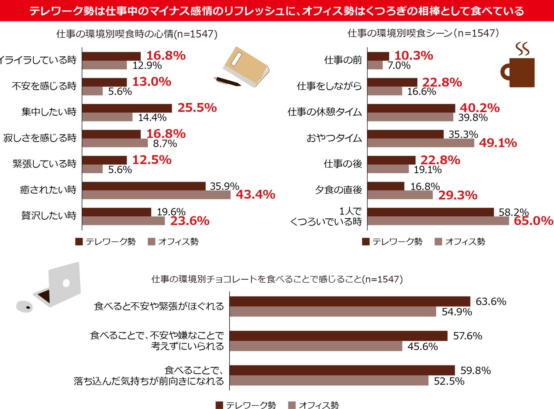 食べる時の心情について、オフィス勢は、テレワーク勢よりも「癒やされたい時(+7.5pt)」「贅沢したい時(+4.0pt)」に食べる人の割合が大きくなっており。チョコレートがくつろぎのアイテムの一つになっているのかもしれません。
