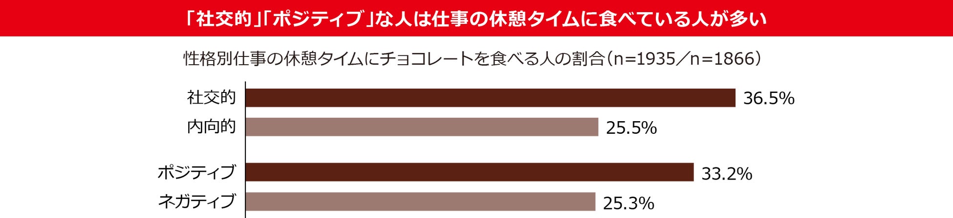 また、「社交的・内向的」「ポジティブ・ネガティブ」のそれぞれで調査したところ、仕事の休憩タイムに食べる人の割合が、「社交的(36.5%)内向的(25.5%)」「ポジティブ(33.2%)ネガティブ(25.3%)」と、社交的・ポジティブな人の方が大きく、チョコレートで休息をとっている様子が伺えました。また、「仕事の前中後」に食べる人の割合も大きい傾向にあり、チョコレートが仕事のお供になっているのかもしれません。チョコレートを食べる時の心情については、社交的・ポジティブな人の方が、「楽しい気分の時」や「贅沢したい時」などプラスの気持ちの時に食べる人の割合が大きいことがわかりました。