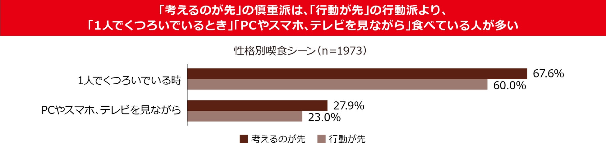 性格による傾向を調査したところ、「考えるのが先」の慎重派は、「行動が先」の行動派より、「1人でくつろいでいるとき」に食べる人の割合が7.6pt大きく、「PCやスマホ、テレビを見ながら」食べている人の割合が4.9pt大きいことがわかりました。また、高頻度で食べている人の割合が、慎重派が41.1%、行動派が36.0%と慎重派の方が5.1pt大きいことがわかりました。