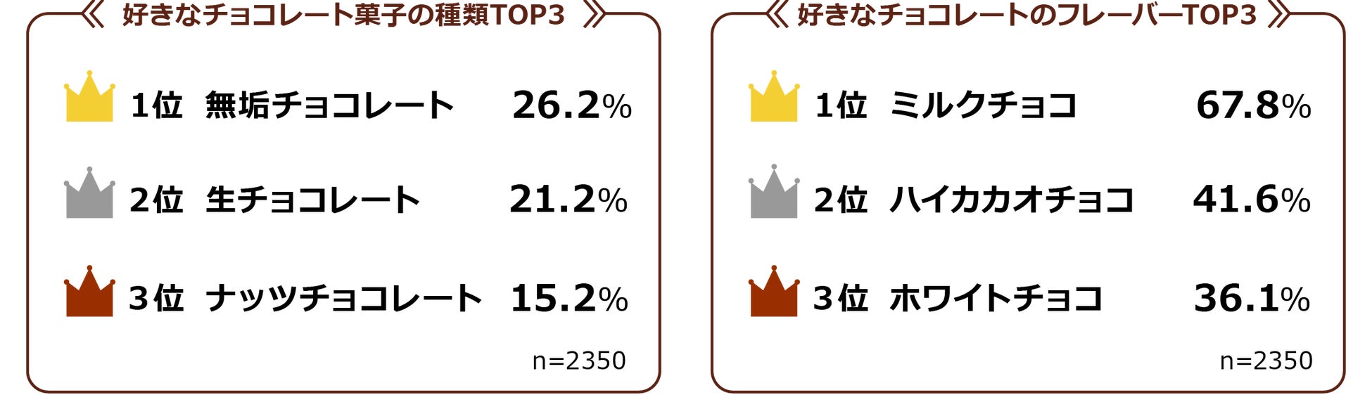 また、好きなチョコレートのフレーバーTOP3は「ミルクチョコレート(67.8%)」「ハイカカオチョコレート(41.6%)」「ホワイトチョコレート(36.1%)」という結果になりました。