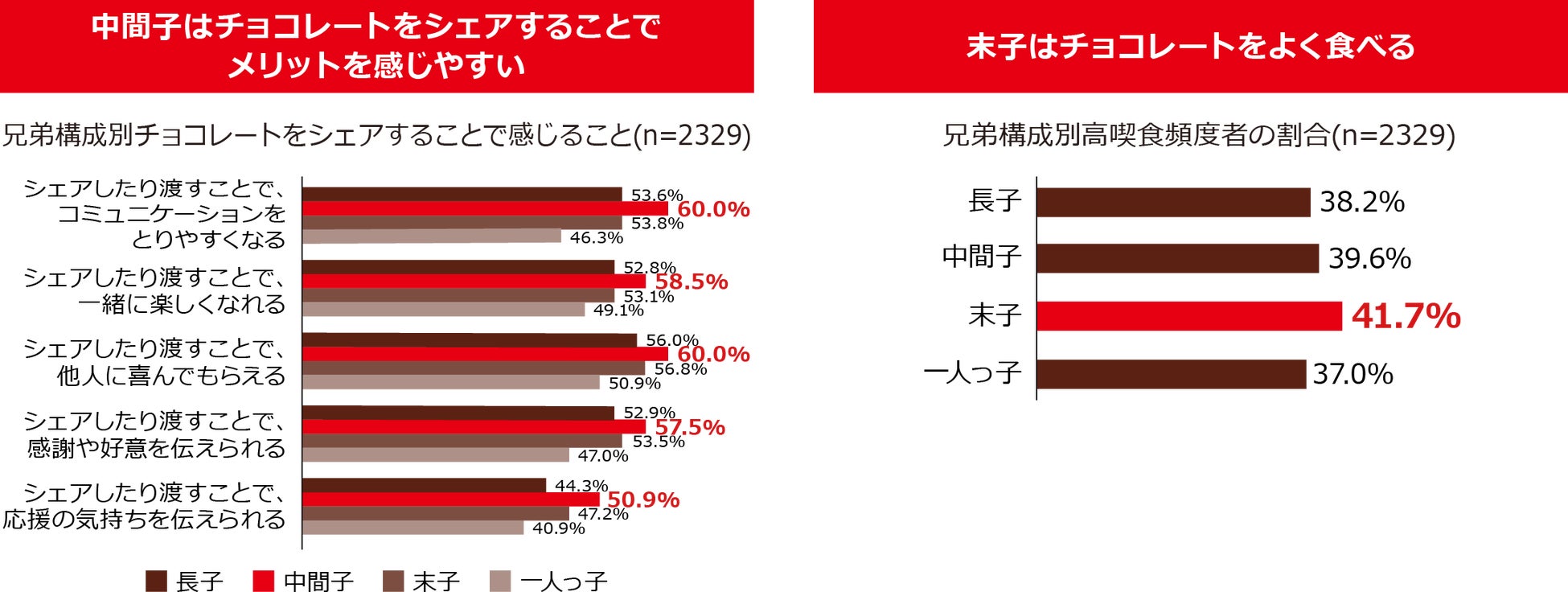 兄弟姉妹の中の位置による傾向を分析しました。チョコレートを食べることで幸福度につながる要素の1つである「シェアしたり渡すことで、コミュニケーションをとりやすくなる」か聞いたところ、中間子が最も感じやすく、一人っ子が最も感じにくいことがわかりました。他、「シェアしたり渡すことで、一緒に楽しくなれる」「シェアしたり渡すことで、他人に喜んでもらえる」「シェアしたり渡すことで、感謝や好意を伝えられる」「シェアしたり渡すことで、応援の気持ちを伝えられる」の4項目でも同様の結果となりました。兄弟とのコミュニケーションが機会が多い中間子はチョコレートをシェアすることでメリットを感じやすく、チョコレートをコミュニケーションツールとして活用しているのかもしれません。