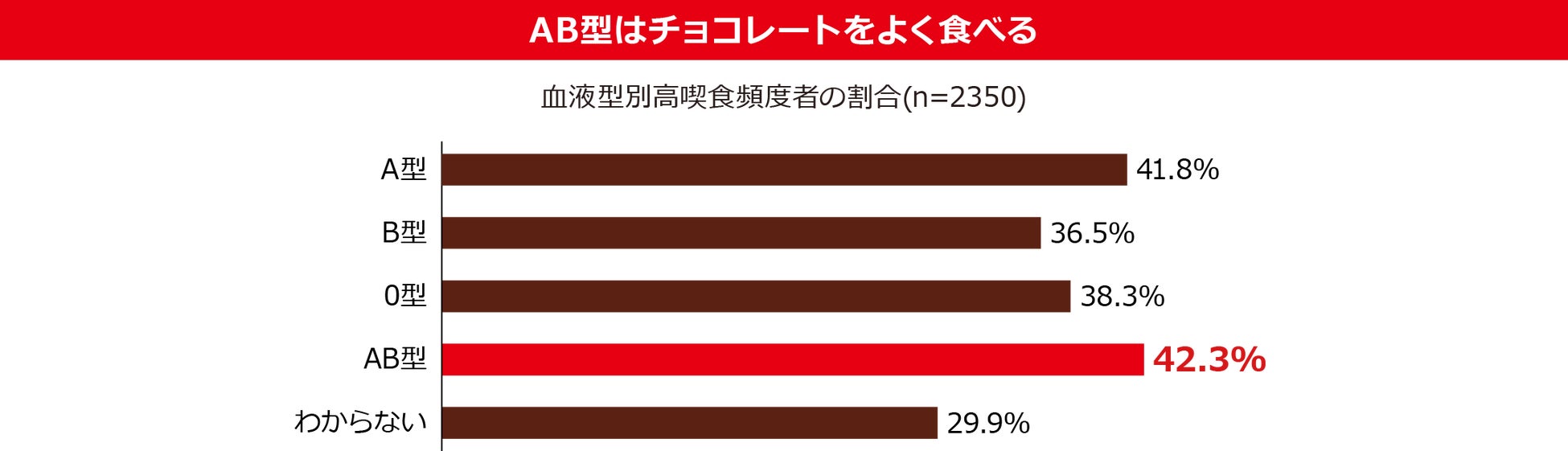 血液型で傾向を分析したところ、チョコレートを高頻度で食べている人の割合が、AB型(42.3%)、A型(41.8%)、O型(38.3%)、B型(36.5%)の順で大きく、AB型が最も高頻度で食べている人が多い結果になりました。