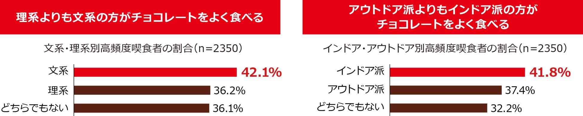 「文系・理系」「インドア派・アウトドア派」による傾向を調査したところ、チョコレートを高頻度で食べている人の割合が、文系が42.1%、理系が36.2%と文系の方が5.9pt大きく、インドア派が41.8%、アウトドアが37.3%とインドア派の方が4.5pt大きいことがわかりました。