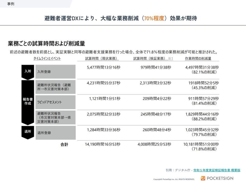 この実証実験では、マイナンバーカードを避難所の受付業務で使いました。カードを読取機にかざすことで、誰がどこの避難所に入所したかが分かり、薬剤情報・医療情報に関しても、マイナポータルと接続することで把握できます。この結果、全体として70%の業務が削減できました。これは、職員数が3倍に増えるような効果です。