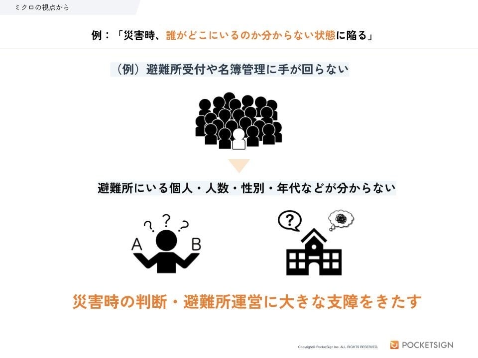 ・災害時の最も典型的な課題として、誰がどこにいるのか分からなくなってしまう、という事態が挙げられます。こういった避難者の安否確認のほか、被災者生活の再建支援のなかでも、避難者と行政とのやり取りが多く発生し、職員と避難者の双方に大きな負荷・負担がかかります。