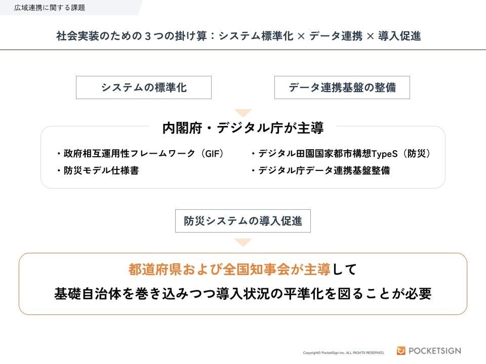 ・大規模災害においては、通勤通学や1.5次避難所から2次避難所への移動などを考えると、市区町村をまたいだ広域連携が必要な場面が数多く発生します。このような事態を想定すると、市区町村ごとにばらばらに動いて防災DXで差が出てしまうと、広域災害対策に支障をきたします。