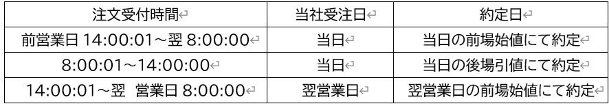 また、注文の有効期間は当日限りとなります。前場終了時に市場価格がない場合は自動的に後場に引き継がれ、後場で成立しなかった場合は注文失効となります。注文失効の場合、お客様にて再度発注が必要となります。