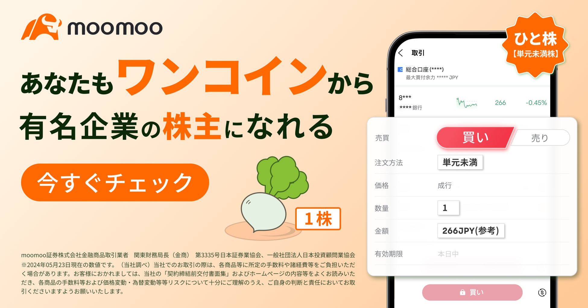 【免責事項】 moomooアプリのご利用は無料ですが、有価証券の取引には手数料が発生します。アプリの内容は、情報提供及び投資家教育のためのものであり、いかなる個別株や投資方法を推奨するものではありません。アプリに掲載される投資情報は説明目的の用途でのみ提供されており、すべての投資家にとって適切であるとは限りません。また、アプリ上の投資情報の内容には個別の投資家の個人的な投資目的、経済状況についての考慮はされておらず、個人への投資助言ではありません。投資家の皆様が投資判断を下される際には、ご自身の状況に基づき、情報の適切性のご判断をお願いいたします。過去の投資実績は、将来の成功を保証するものではありません。すべての投資は、リスクや元本割れの可能性を免れることが出来ません。