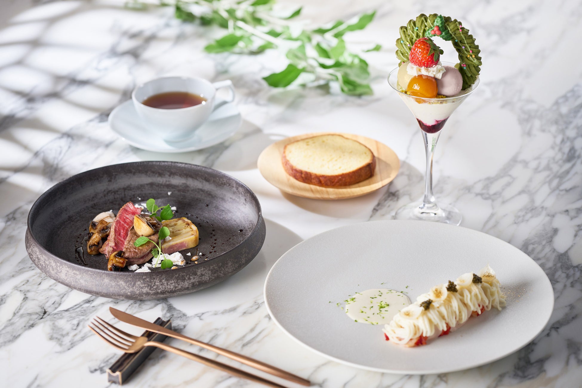 12月24日(水)・25日(木)には、特別感のある食材を組み合わせたスペシャルランチコースをご提供。オマール海老と帆立に、ゆり根のやさしい甘みを生かしたピューレを合わせた華やかな前菜から始まり、メインには香り高いトリュフパウダーをまとわせた仙台牛フィレ肉のローストとジャガイモのテリーヌをご用意しています。