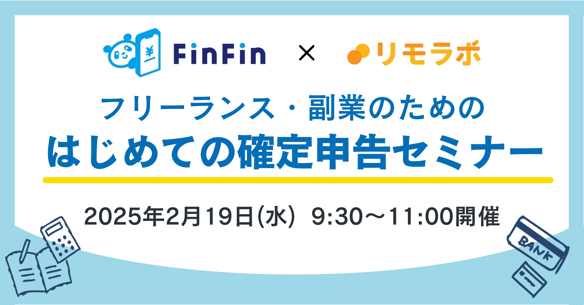 「女性のキャリアをシームレスに」の実現に向けて、個人向けリモートワーク実践スクール事業「リモラボ」を運営する株式会社リモラボ(東京都渋谷区、代表取締役 佐伯正邦、以下「当社」)は、「新たな信用基盤で、フリーランスが活躍できる社会をつくる。」をミッションに、フリーランス/個人事業主や副業者向けスマホ会計アプリ「FinFin」を提供する会計バンク株式会社(東京都千代田区大手町、代表取締役社長:反町 秀樹、以下「会計バンク」)によるリモラボメンバー*向け特別セミナー『フリーランス・副業のためのはじめての確定申告セミナー』を、2025年2月19日(水)に開講いたします。