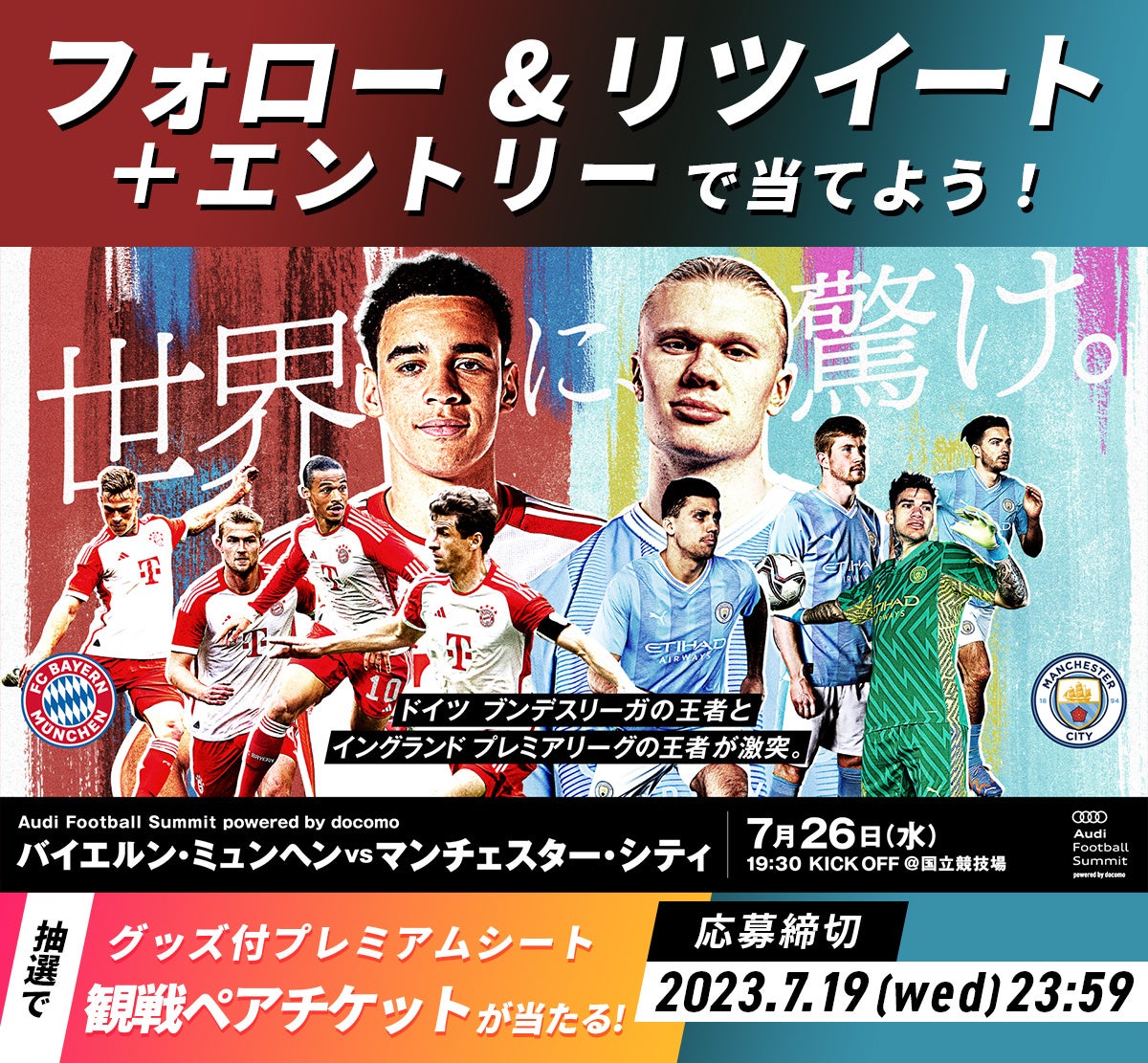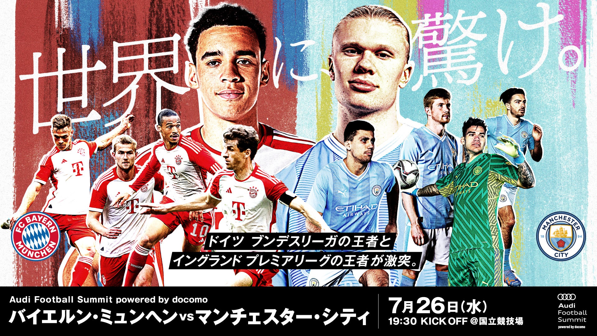 この度、 2023年7月23日(日)に「明治安田Jリーグワールドチャレンジ2023 powered by docomo」と題して横浜F・マリノス vs. マンチェスター・シティFC戦を開催。そして、7月26日(水)には「Audi Football Summit powered by docomo」と題したFCバイエルン・ミュンヘン vs. マンチェスター・シティFC戦を開催いたします。