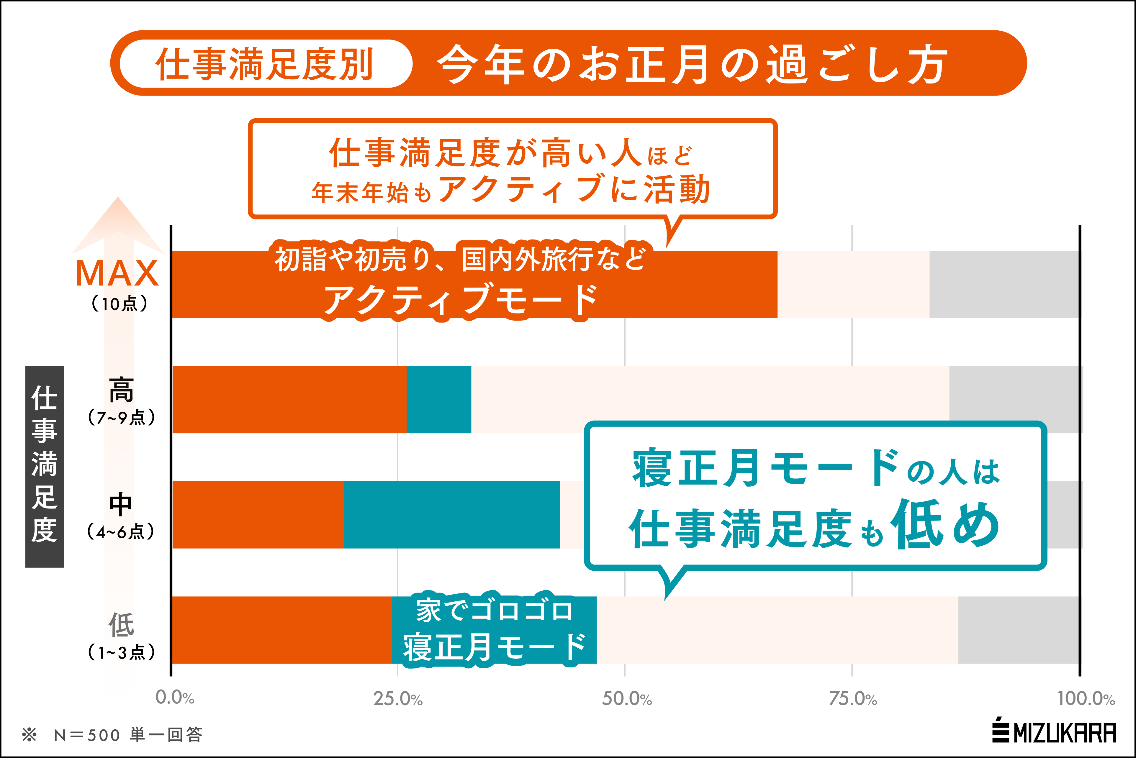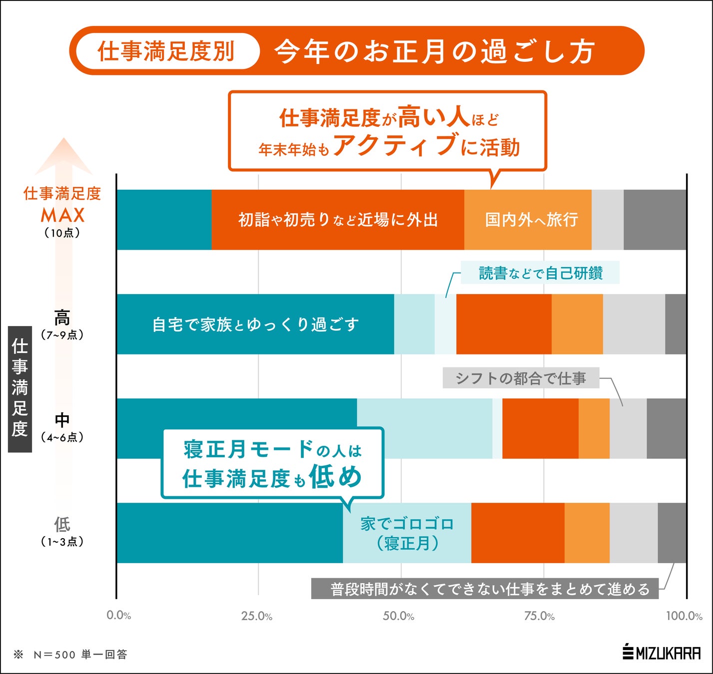 認知科学に基づくコーチングを法人・個人に提供する株式会社ミズカラ(本社:東京都千代田区、代表取締役 山宮健太朗)は、2025年11月18日(火)に25歳~59歳の既婚有職男女500名を対象とした「年末年始の過ごし方と仕事満足度の相関」調査を行いました。