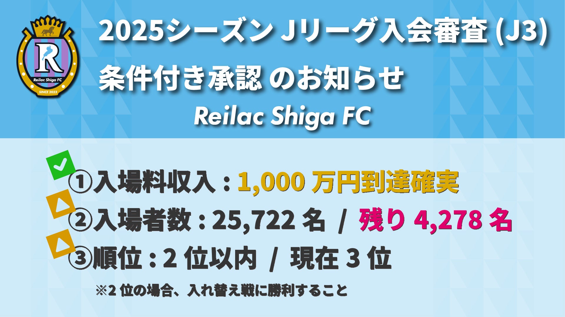 このたび、株式会社Mi-Oスポーツ(本社:滋賀県草津市西大路町4-32クサツエストピアホテル2F-6、代表取締役:内林広高)が運営するレイラック滋賀FCは、10月29日に開催された公益社団法人日本プロサッカーリーグ(Jリーグ)の理事会において、2025シーズン Jリーグ入会審査(J3)について、「条件付き承認」となりましたことをご報告いたします。