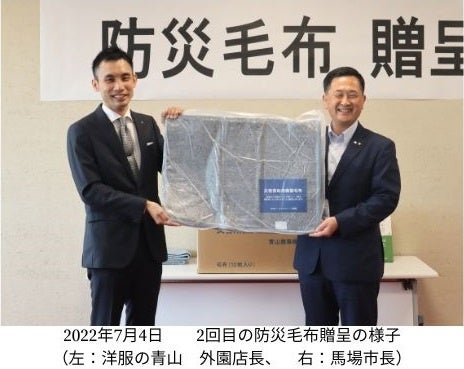 当社では、①過去に大規模な自然災害を経験した地域であること ②災害発生時に物資が届きにくい離島や遠隔地であること ③当社店舗を営業している地域であること の3つを基準に、防災毛布寄贈の取り組みを行っています。天草市は、御所浦島などの“離島”を有するという地域特性があるとともに、「令和2年7月豪雨」を経験されていること、当社店舗「洋服の青山 本渡亀場店」があることから、同市へ2021年・2022年に防災毛布を100枚ずつ(計200枚)寄贈し災害対策の強化にお役立ていただいています。