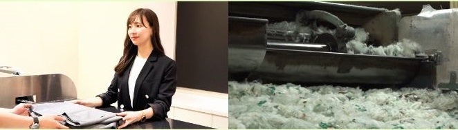 ・「洋服の青山」「ザ・スーツカンパニー」で回収されたスーツの一部は、工場で裁断され、ガーネット反毛織で綿状に加工されます。その後、 綿状になった原料と再生ポリエステルを混ぜ合わせ、糸の元が作られます。