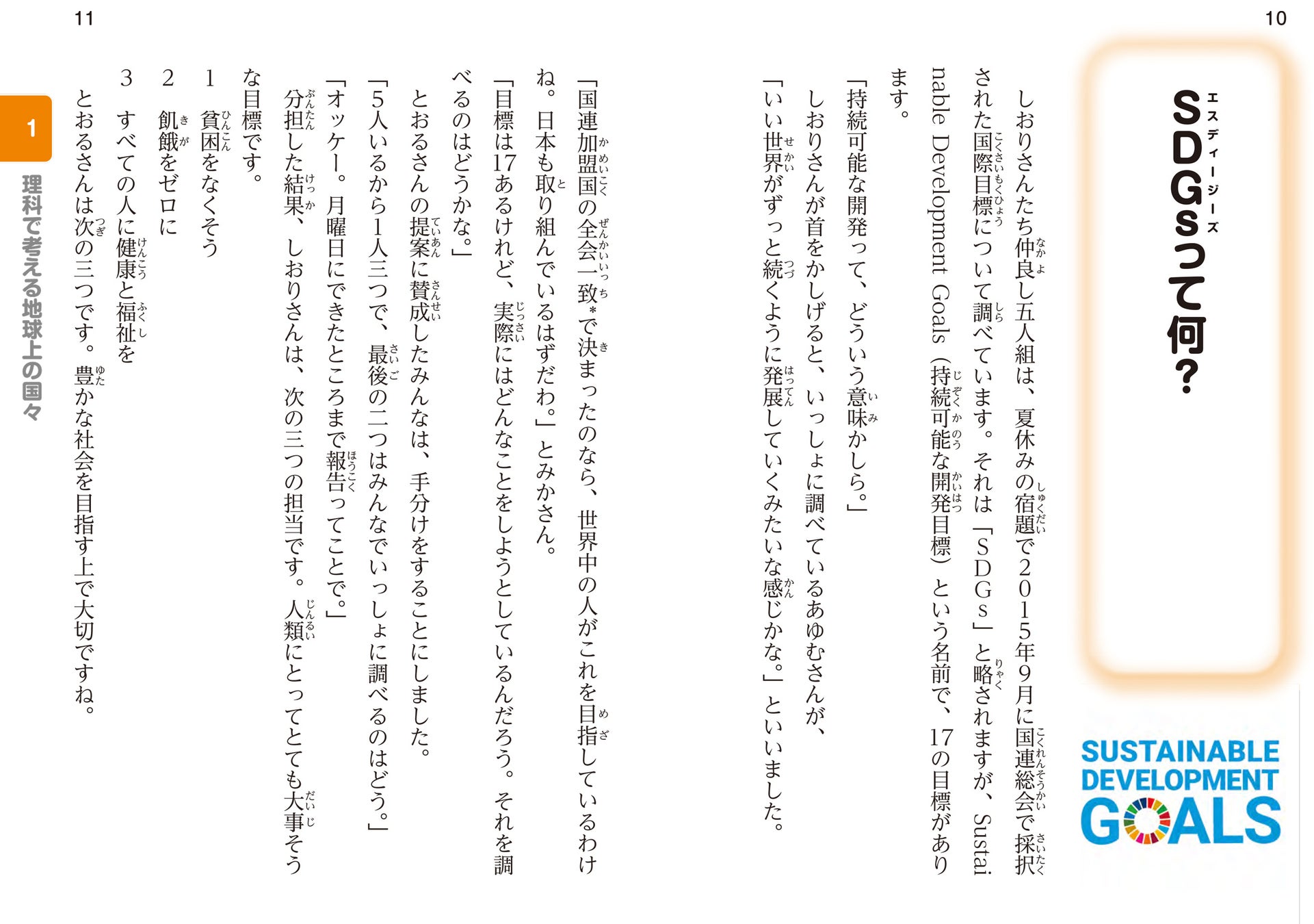 1)これからの子どもたちにはSDGsという大きな課題があります。環境、エネルギー、食糧、医療、人権、性差など、多くの問題と向き合っていかなければなりません。本書は理科的思考から、SDGsの課題を考えられるようになっています。