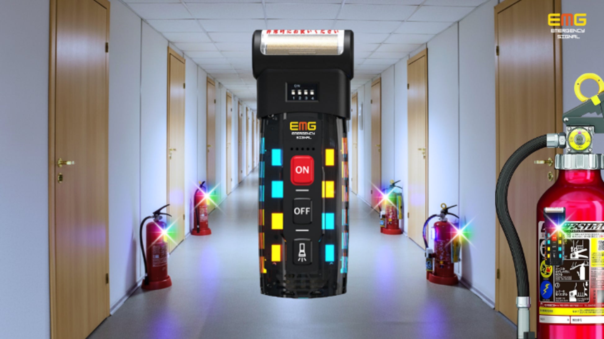 消火器の使用を検知し、エリア内のデバイスが一斉に「光と音」