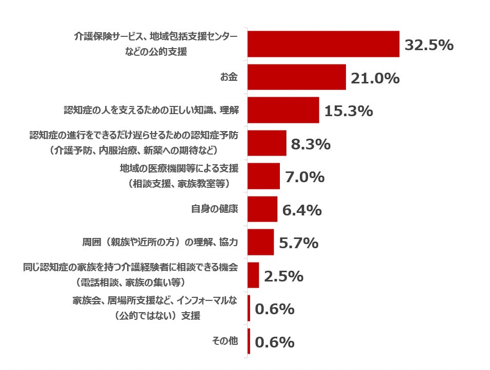 「一緒に暮らす家族等」が認知症(または軽度の認知機能障害)になった際は、まずは「介護保険サービスや地域包括支援センターといった公的支援」を必要としますが、それを支える立場として「お金」や「認知症の人を支えるための正しい知識、理解」の必要性を感じていることがわかりました。ただ、公的支援を必要とする方が32.5%に留まっていることは、認知症は家族の問題として相談しづらく抱え込んでいる可能性も考えられるため、広く誰もが認知症を理解し支え合える世の中にしてくことが大切なのかもしれません。
