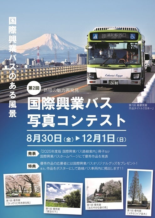 優秀作品には記念品として「国際興業バスオリジナルグッズ」をプレゼントし、来年度発行する「2025年度版国際興業路線案内」冊子、及び国際興業バスホームページで発表します。さらに、路線を管轄している営業所のバス車内にポスターを掲出し、多くの方に作品をご紹介する予定です。応募期間は8月30日~12月1日まで。たくさんのご応募をお待ちしています。