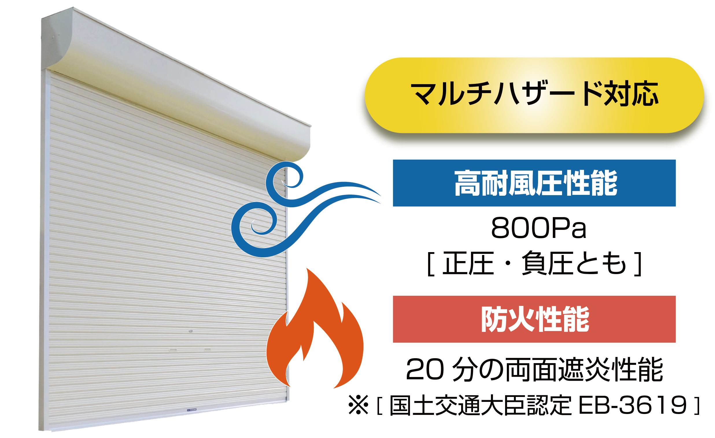 シャッターを閉鎖するだけで耐風圧性能800㎩(正圧・負圧とも)という高い耐風圧性能を発揮することに加え、防火性能も確保。シャッターひとつで強風や火災から室内の安全と大切な財産を守ります。