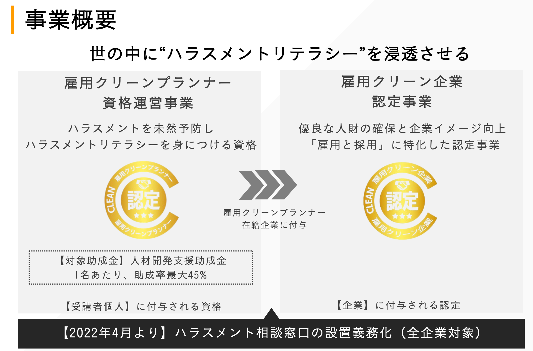 ”働きやすい会社”を新しく定義する「雇用クリーン」認定事業を行っています。『雇用クリーンプランナー』は、労働法、労務、ハラスメントリテラシーを学習して、企業内での労働トラブルやハラスメントトラブルを未然に予防するための資格です。(労働トラブル相談士の内容をよりバージョンアップさせて「雇用クリーンプランナー」として生まれ変わりました)『雇⽤クリーン企業認定』は、クレア⼈財育英協会が実施している雇⽤クリーンプランナー在籍企業に対して付与・認定する事業です。企業はそのことを認定マークを外部にアピールでき、就職希望者との採用ミスマッチを低減できます。
