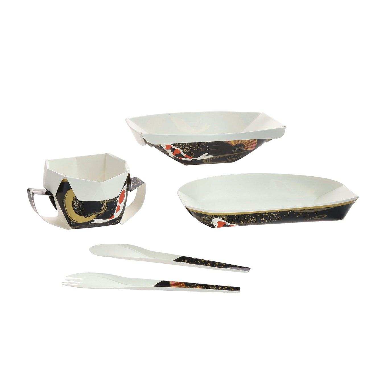 作品説明:A4サイズの平らな紙を折り畳んで組み立てる紙製の食器。100人分の紙食器を、組み立て前に積み重ねた厚さはわずか45mm。耐熱・耐水・耐油性に優れながらも2年で自然分解される紙を使用。世界中で自然災害などから避難を余儀なくされている被災者たち対する支援グッズとして制作。2024年1月、石川県で発生した能登半島地震の際には、被災地へ10,000シートを支援物資として寄贈。
