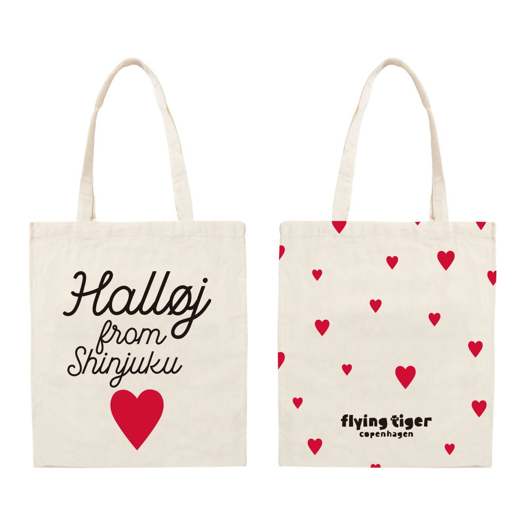 Flying Tiger Copenhagenでは、各店限定の『ストアリミテッドバッグ』を販売しています。〈京王新宿ストア〉では、デンマークの人たちが大好きなモチーフ”ハート”と、メッセージ“Halløj from Shinjuku” (デンマーク語で「新宿からこんにちは!」)を配したバッグを展開。2/22(木)のオープン日、先着100名様に、この『ストアリミテッドバッグ』をプレゼントします。