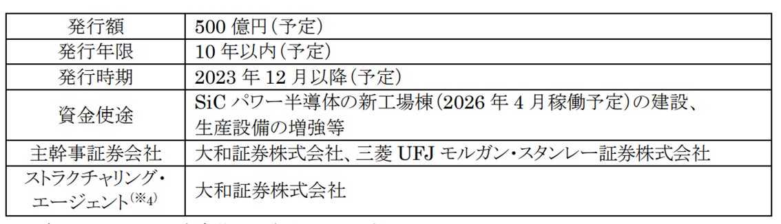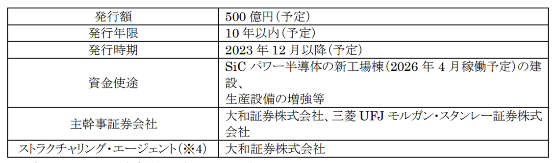 グリーンボンドとは、企業や地方自治体等の発行体が、国内外の適格なグリーンプロジェクトに要する資金を調達するために発行する債券です。本社債の発行により調達する資金は、SiCパワー半導体の新工場棟(2026年4月稼働予定)の建設や生産設備の増強等(※1)に充当します。